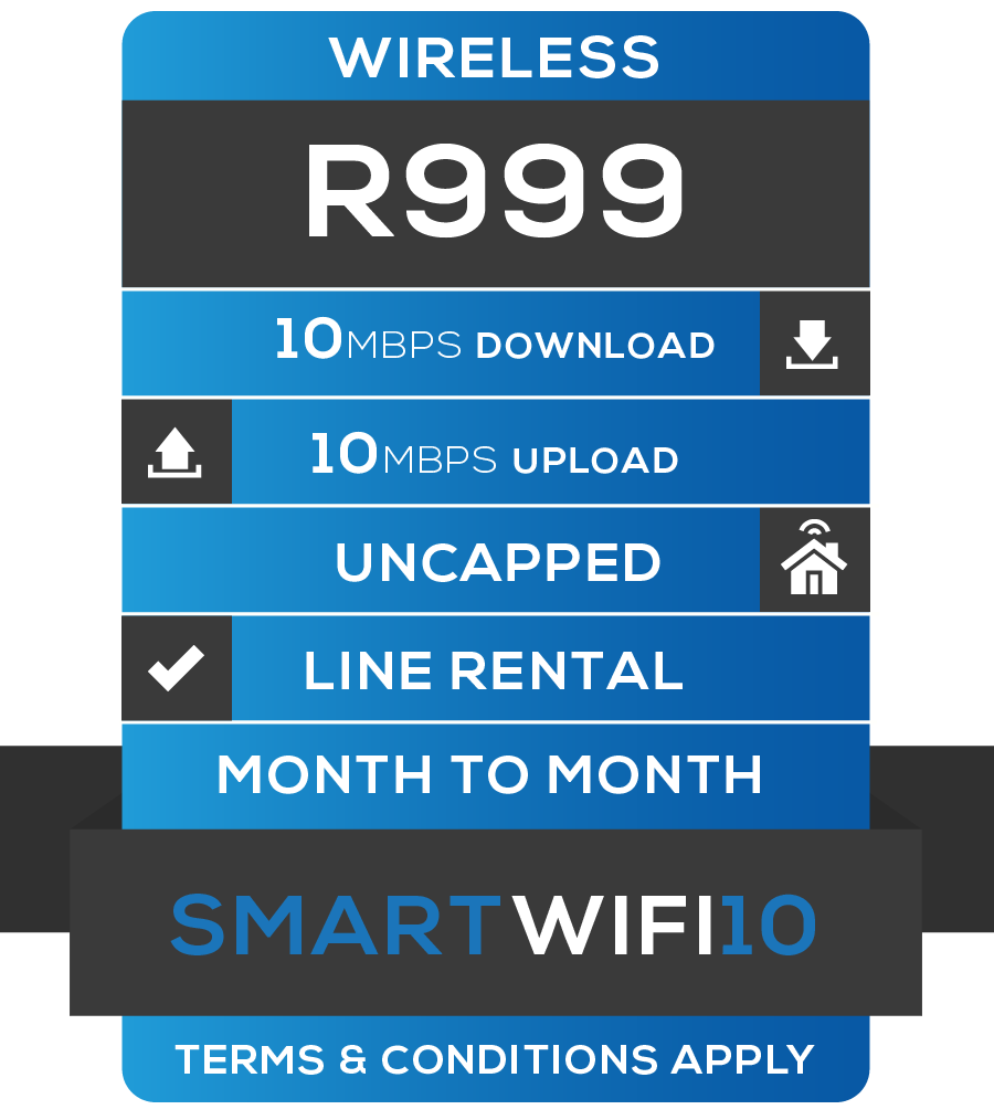 | SMARTwifi10 | 10 Mbps | 10 Mbps | UNCAPPED | R999/pm |